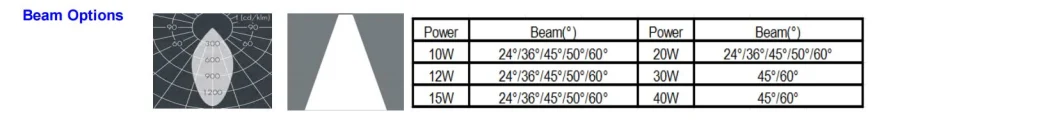 | Luminous Flux | 10W 1000lm/12W 1200lm/15W 1500lm/20W 2000lm/30W 3000lm/40W 4000lm |